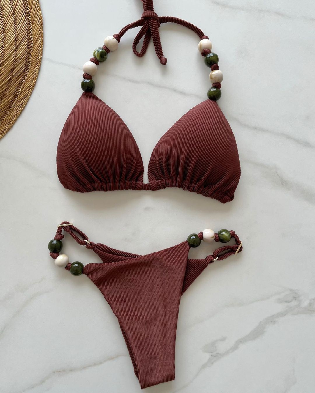 Biquíni Pérola Verde Sálvia Marrom Detalhes em Pedras Calcinha Fio Duplo Flora – Ric Resortwear