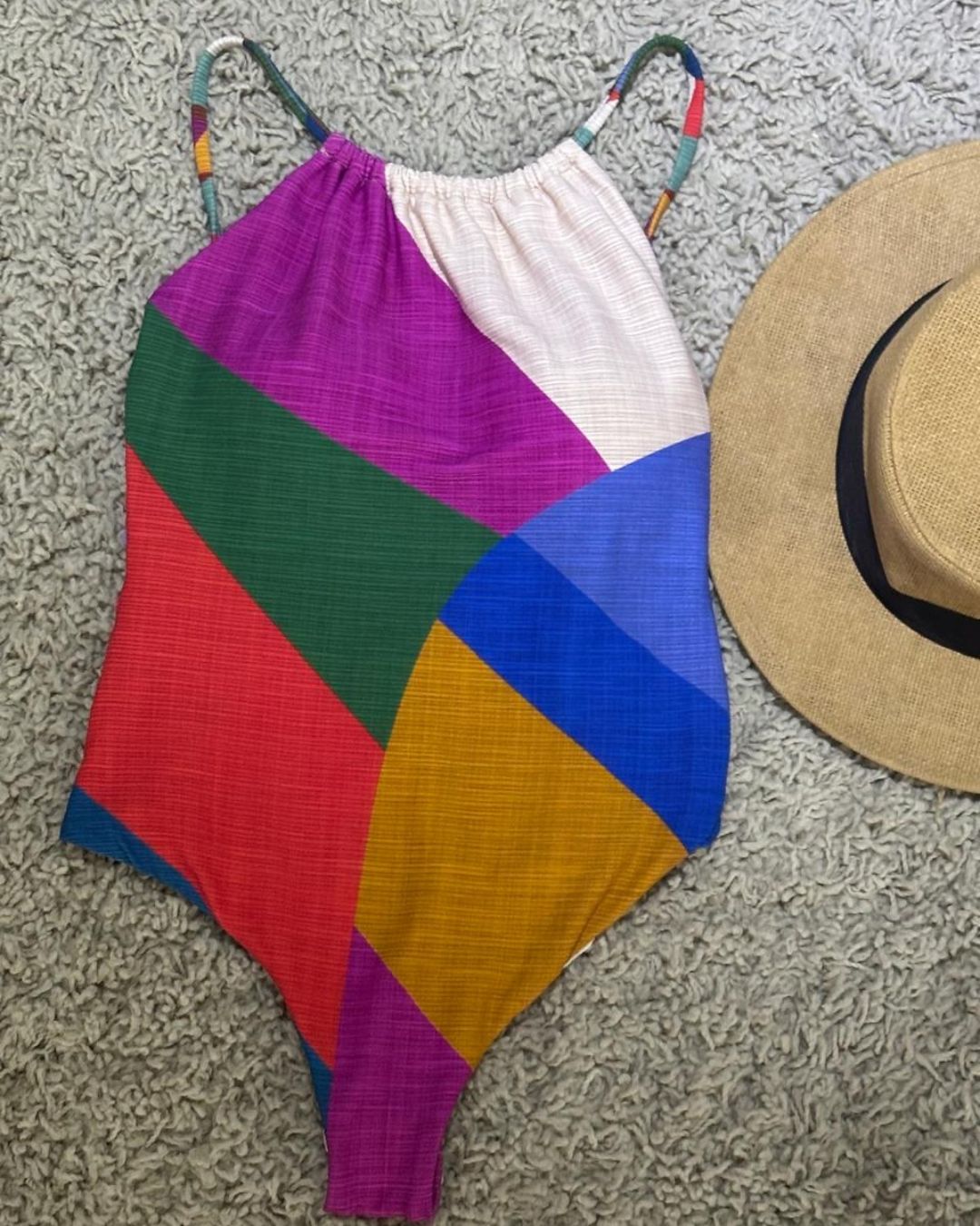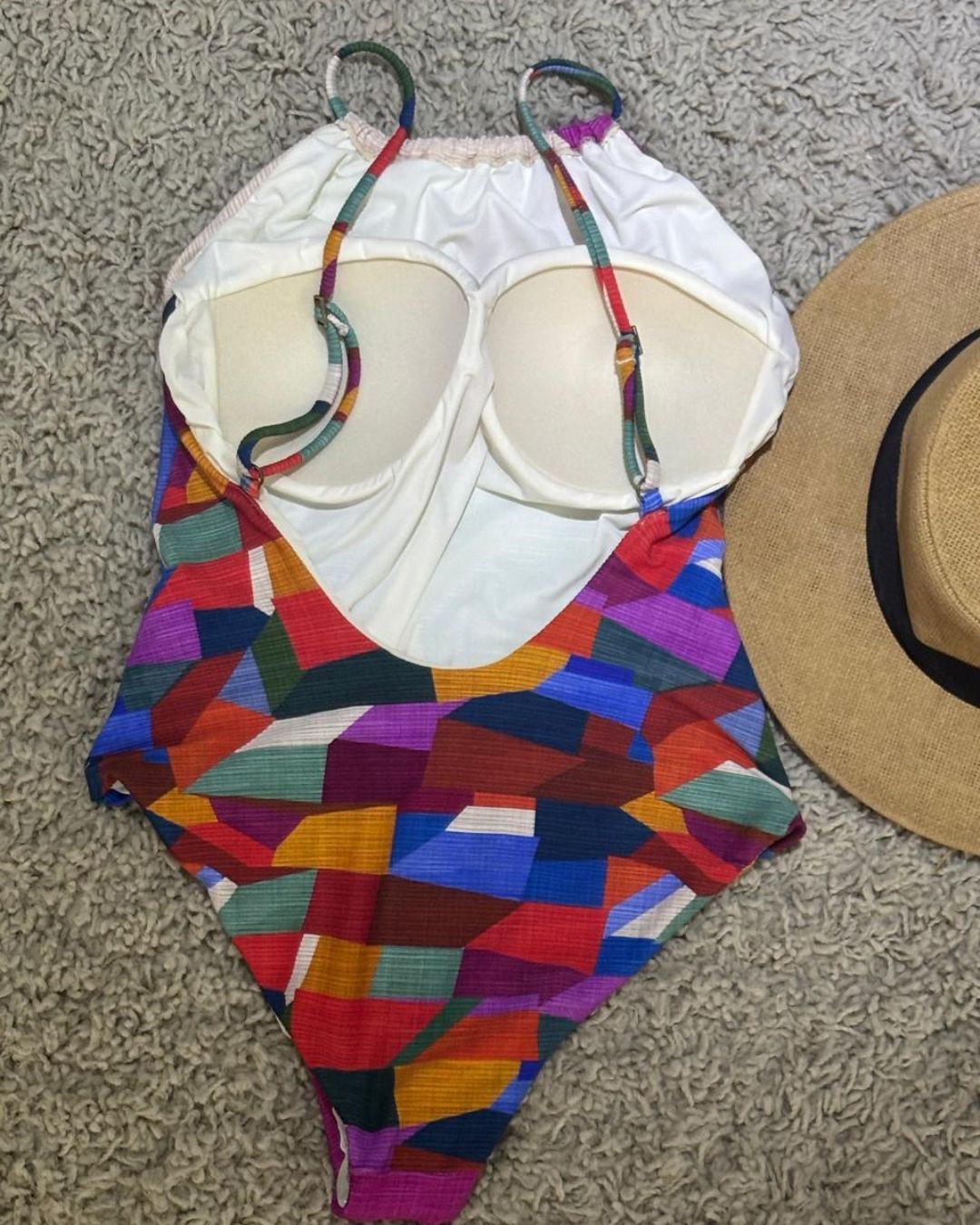 Maiô colorido com bojo removível e alças reguláveis. Modelo frente única com estampa geométrica vibrante e tecido confortável, ideal para um visual moderno e alegre.