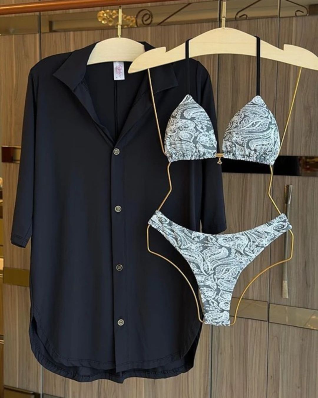 Conjunto Biquíni Cortininha Calcinha Asa Delta Estampado Preto e Branco + Chemise Preta – Ric Resortwear