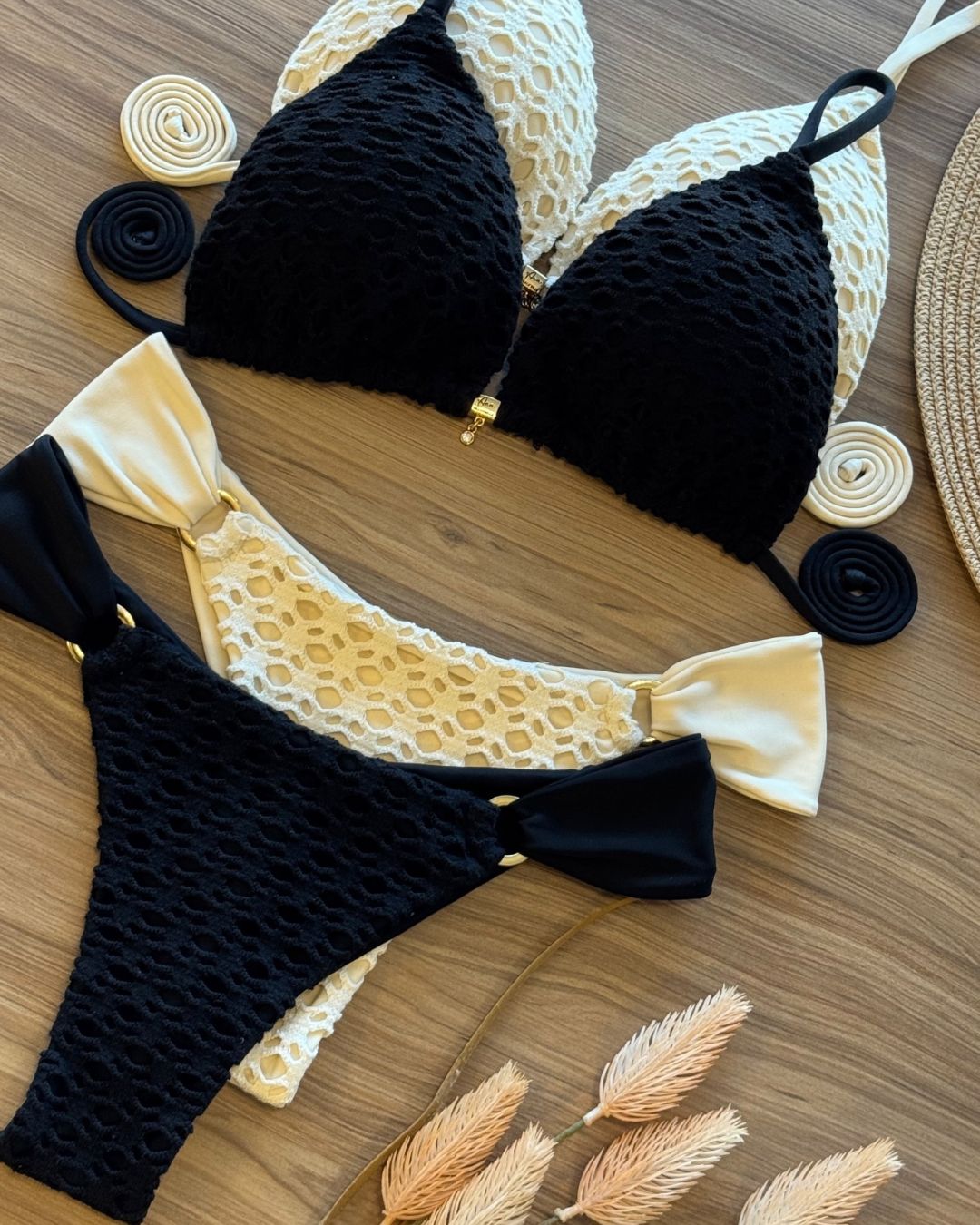 Biquíni Texturizado Off-White Preto Calcinha Borboleta Fio Duplo