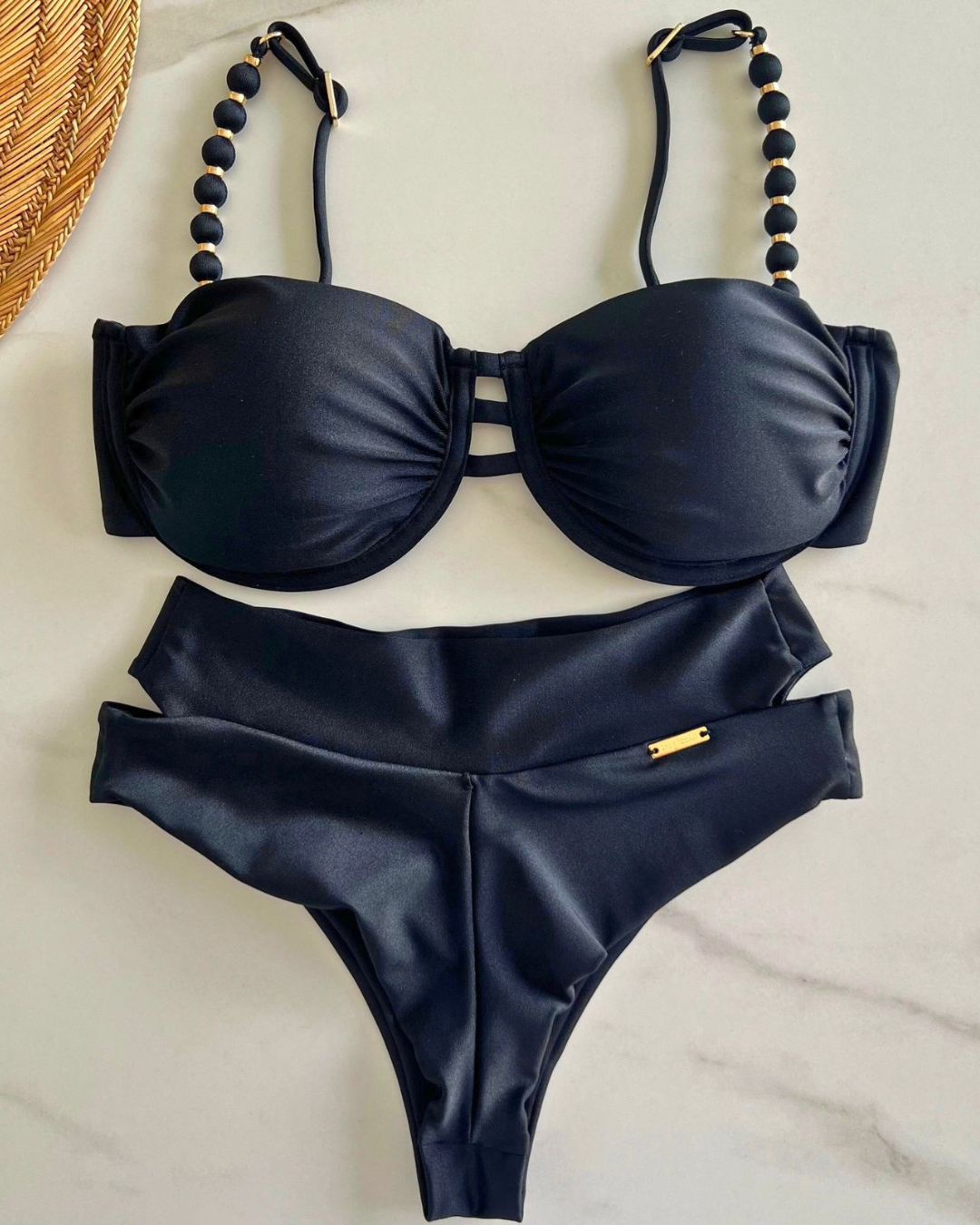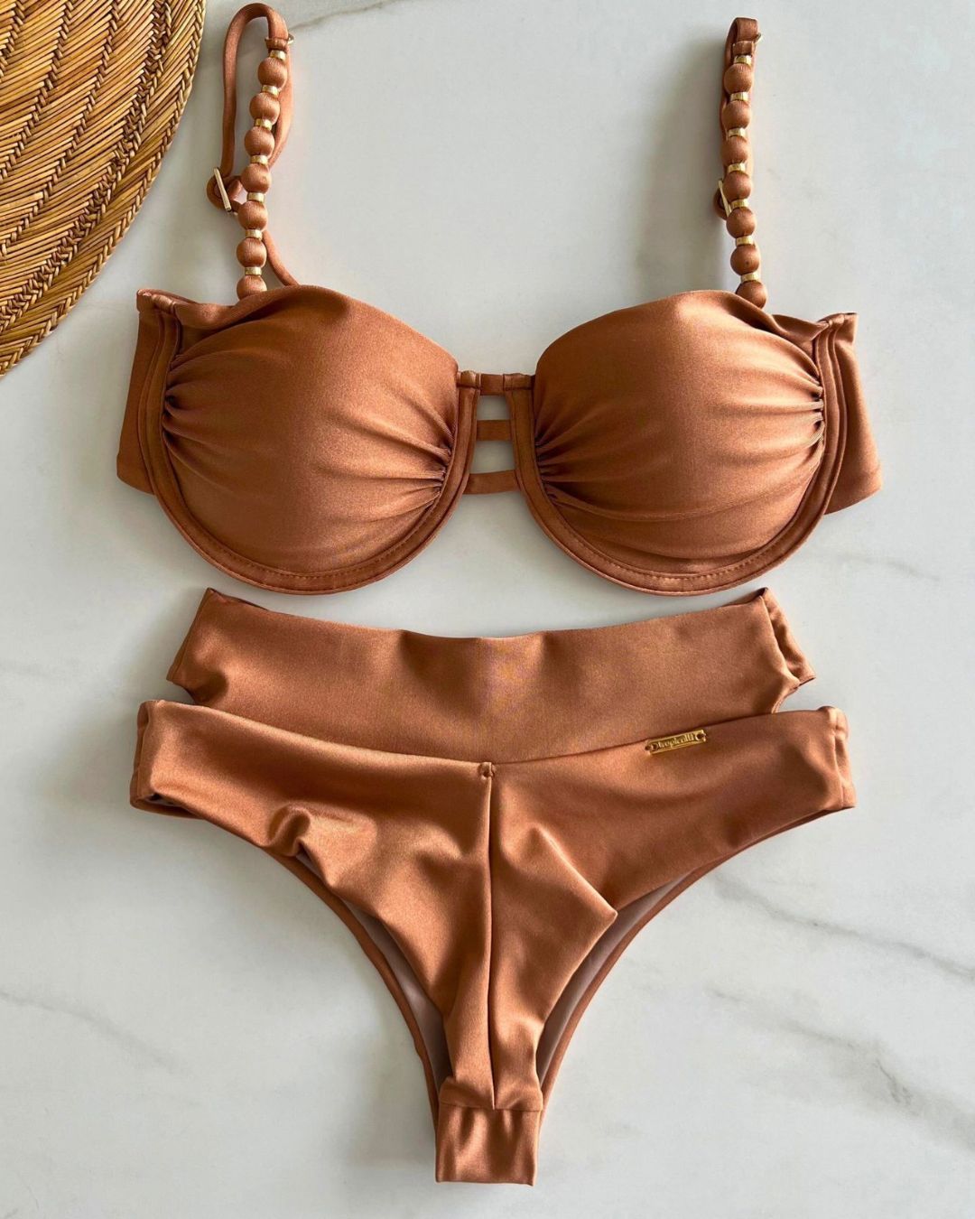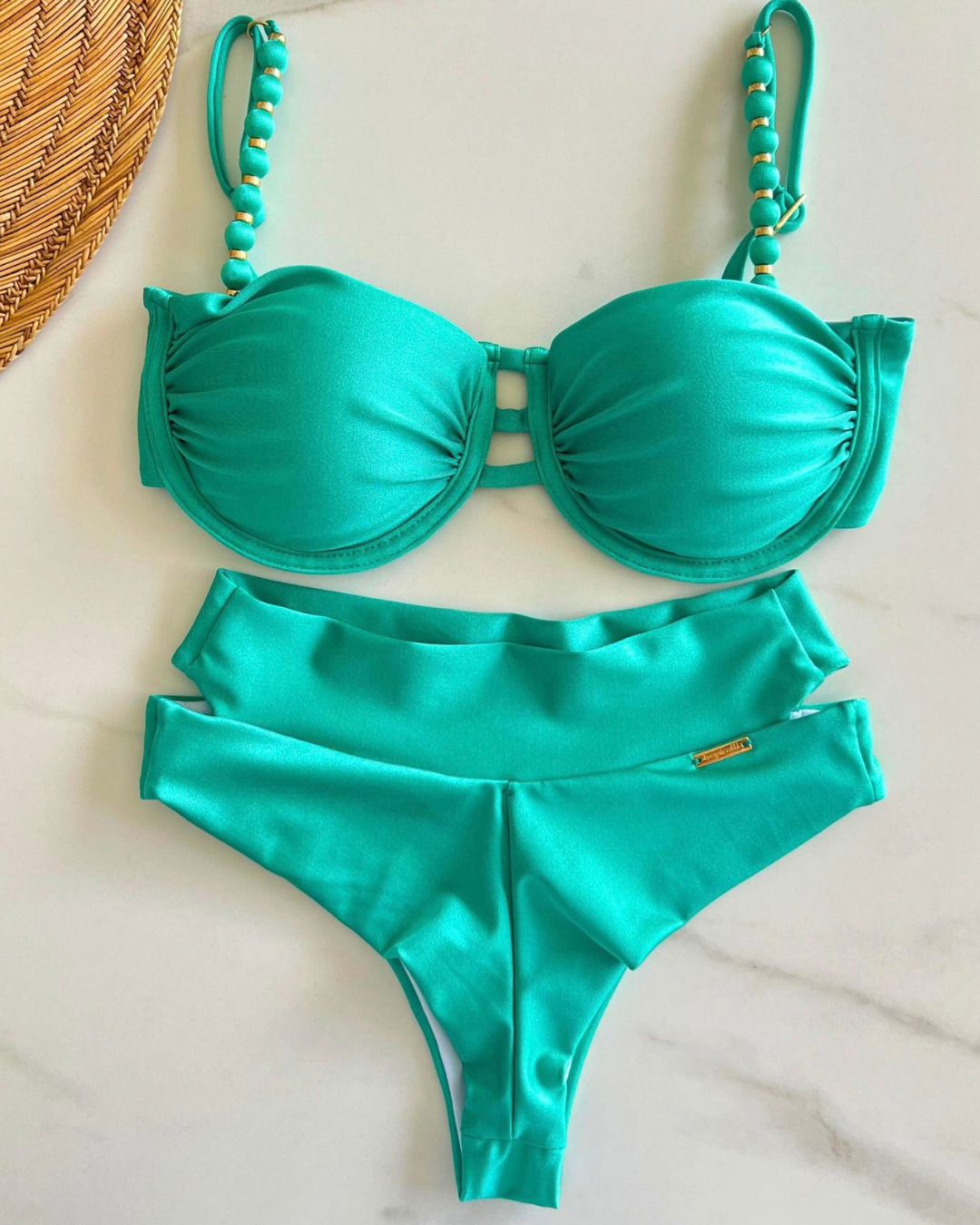 Biquíni Meia Taça Cut Out Calcinha Fio Duplo Cores Aurora *Confeccionado em trilobal beach.*Meia taça com aro que proporciona encaixe e sustentação ao seio.*Alças trabalhadas em metais e pérolas.*Calcinha modelo cut out com bumbum fio duplo*Bojo removível e metais banhados.