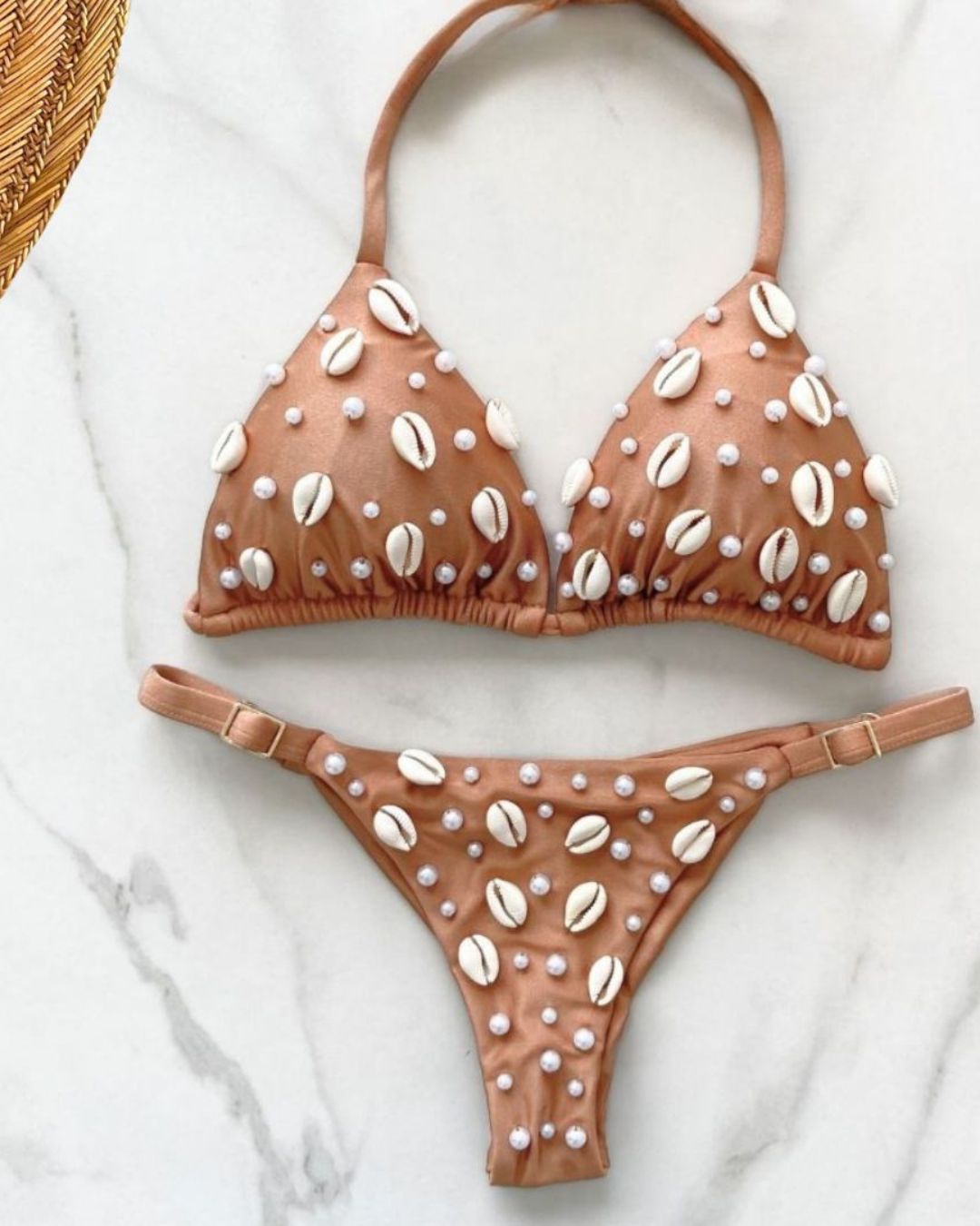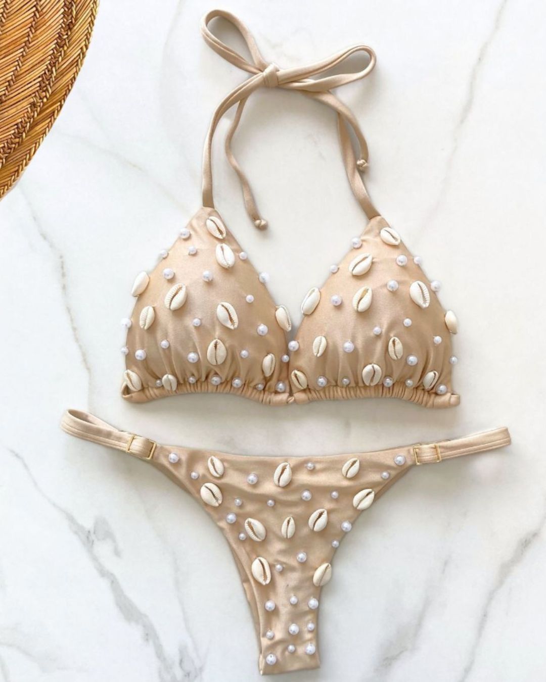 Biquíni Bronze Champanhe Bordado Conchas Pérolas Calcinha Fio Duplo