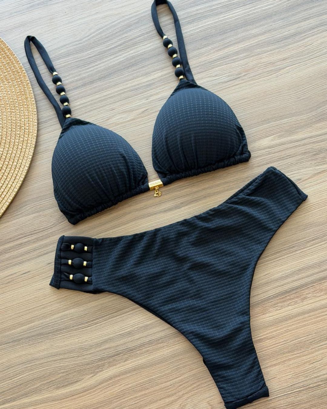 Biquíni Cortininha Preto Calcinha Asa Delta Perolas e Metais Fio Duplo